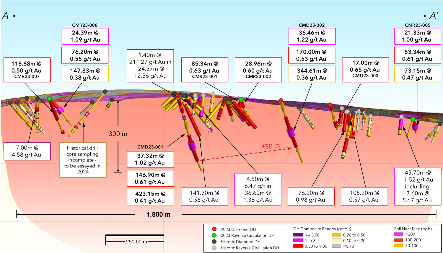 Figure 4: Long Section 2023 and Historic Drilling at Chicken Mountain from C-C’ Referenced in Figure 1 Plan Map