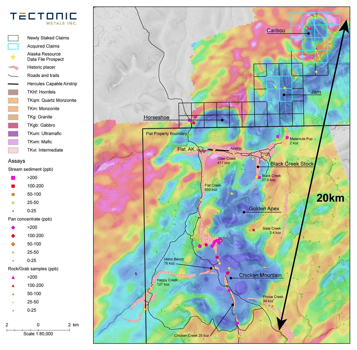 "Introducing ‘The Flat Gold System' - a network of interconnected geophysical anomalies that indicate six confirmed or potential intrusion related gold systems. Spanning a 20km trend, these intrusion targets are significant in size and interpreted to be bedrock sources for placer gold, reinforcing our belief that Flat is a Tier One Opportunity," stated Tony Reda, President and Chief Executive Officer of Tectonic. "It is truly remarkable that our company has access to such a large number of intrusion targets, which would be nearly impossible in a more established, mature, exploration and mining district. There is a collective sense of relief and excitement now that we have secured the right to explore these three additional potential intrusions north of the Flat Gold Project.