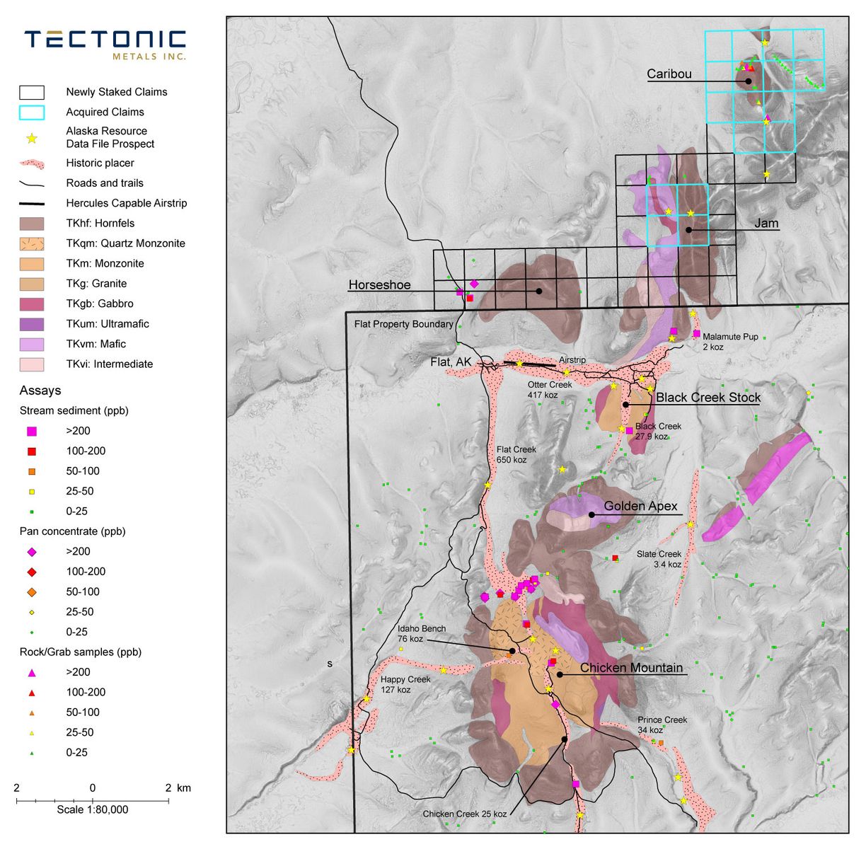 The newly acquired third party claims are comprised of two groups: the Jam and Caribou Blocks. The Jam group comprises a 640 acre claim (4 x 160 acres state claims) covering an area of exposed monzonite intrusion, volcanic cap rocks and related hornfels, and hosts several historic gold showings.