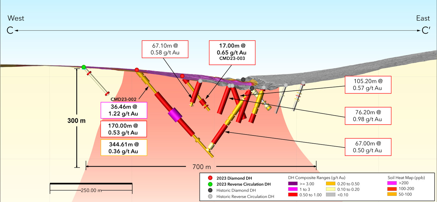 Figure 4: Long Section 2023 and Historic Drilling at Chicken Mountain from C-C’ Referenced in Figure 1 Plan Map