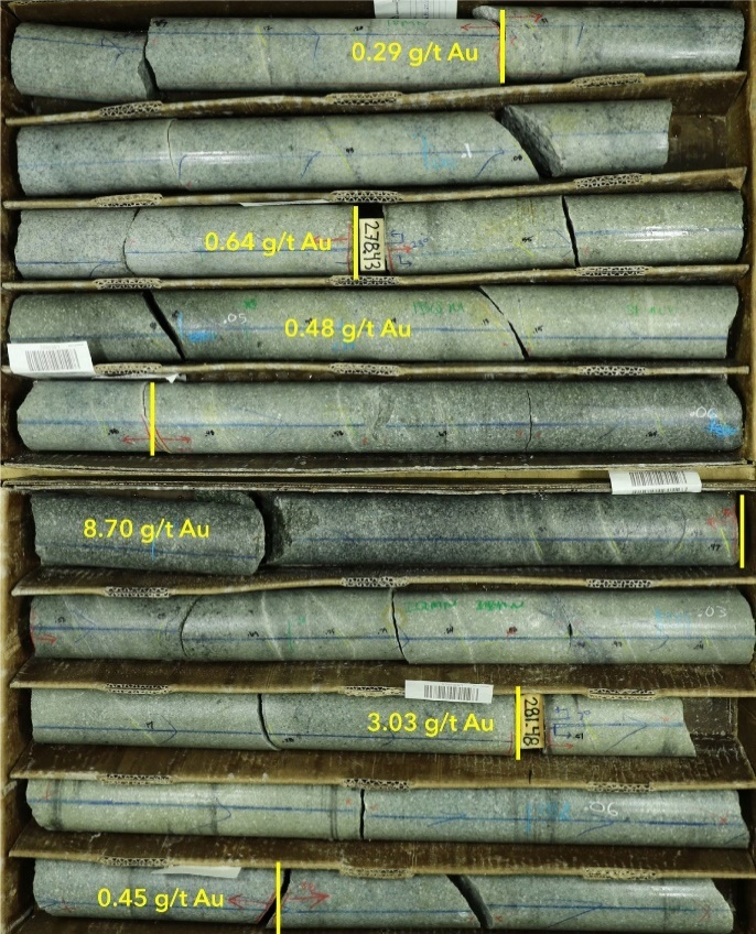 All widths are interval widths as insufficient data exists currently to determine true zone widths. Drill holes ending in greater than 0.10 g/t Au are noted in table below...