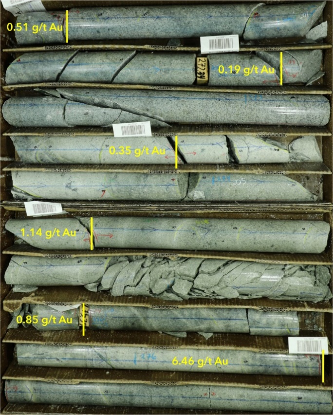 Flat drill core shown below exhibits classic Fort Knox / Reduced Intrusion Related Gold System (RIRGS) mineralization, including sheeted quartz-sulphide veinlets forming in cracks and fractures within the host rock and acting as pathways for mineralizing fluids to flow through. Pervasive sericite alteration is another common feature associated with RIRGS and observed in the Flat drill core. This type of alteration occurs when hydrothermal fluids interact with rocks, causing the replacement of minerals such as feldspar and biotite with sericite. This alteration can often be seen as a distinct white or grey color in the host rock as shown in the photos below. Understanding the processes and features associated with RIRGS is essential for successful exploration and mining of these types of deposits.