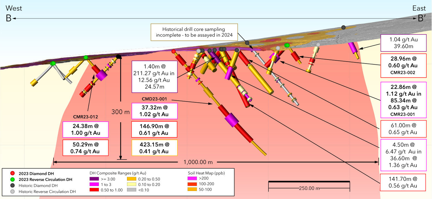 Figure 3: Long Section of 2023 and Historic Drilling at Chicken Mountain from B-B’ Referenced in Figure 1 Plan Map