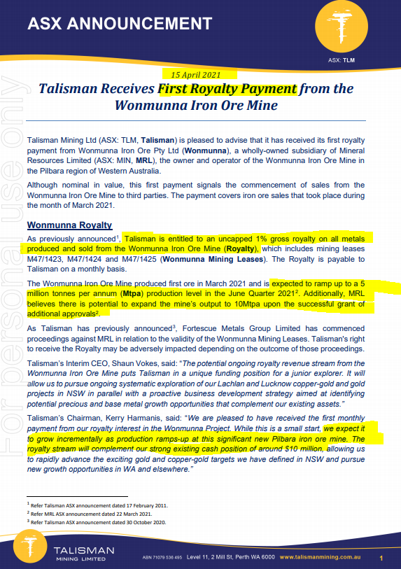 Dacht ich auch... aber was ich mir den ganzen Tag so denke... Dass es die Royalty negativ betreffen könnte steht ja in exakt der Stelle, die Du zitierst. Wieso weshalb - Fehlanzeige. Vielleicht nur, weil es im Falle des Konzessionsübergangs eine Unterbrechung beim Abbau geben könnte? Finde leider bei Talisman auch nix über die Höhe der Royalty bei geplanter Kapazität der Mine. Wirklich keine leuchtende Fackel der Transparenz.
