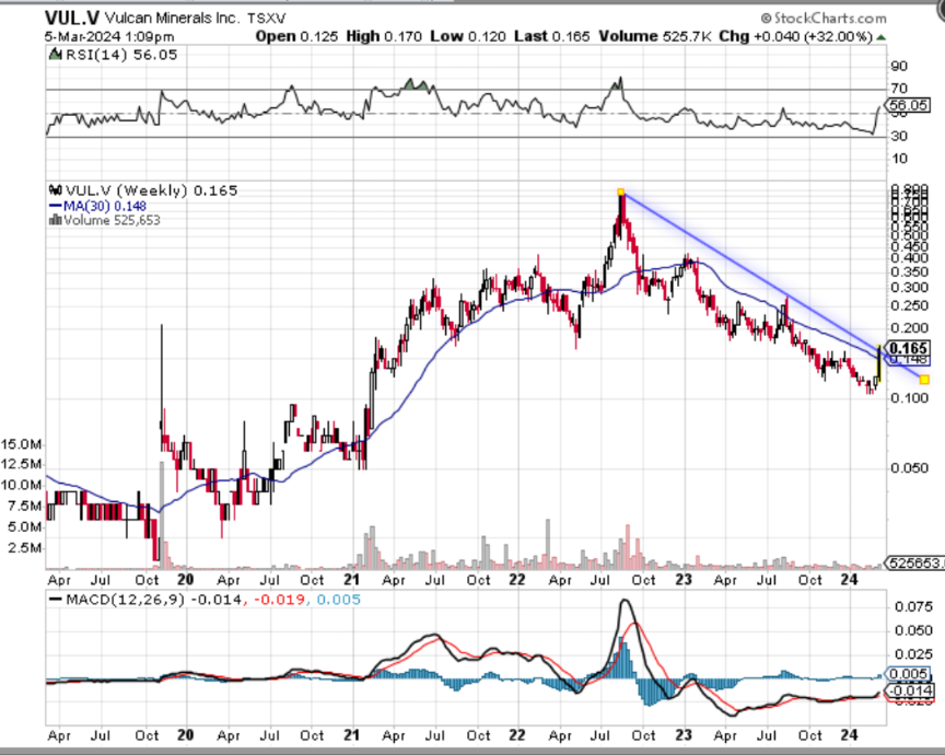 VUL.V hält eine wesentliche Royalty auf das Projekt ihres Spin-offs SALT.V, die eine der größten und am günstigsten abzubauenden bekannten Lagerstätten für Salz (wie NaCl oder Streusalz) in Nordamerika entwickeln. Ich fand es faszinierend mich da einzulesen. Das Nordamerikanische Streusalz für die Straßen kommt zum großen Teil aus Afrika!
