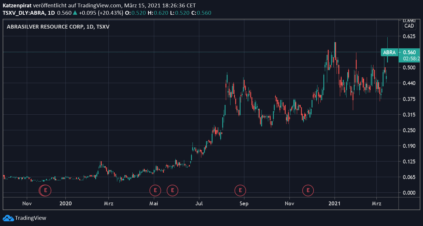 Wer Silberminen liebt, aber nicht all sein Geld in Mexiko verlochen will, kommt um einige wenige Unternehmen in Südamerika nicht herum. AbraSilver gehört dazu! In den letzten 12 Monaten haben sie 1'000 % aufs Parkett gelegt. ![]()