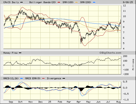 CS / CSCCF mit beeindruckendem Trendkanälen mit einem ATH nach dem anderen, momentan 9,65 C$. Beachtenswert lange steigender MACD.
