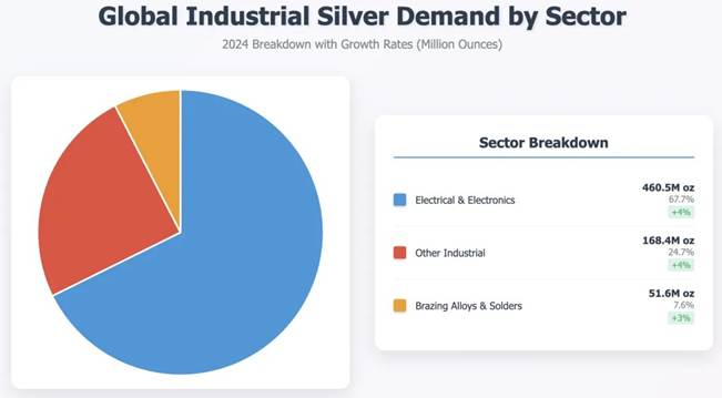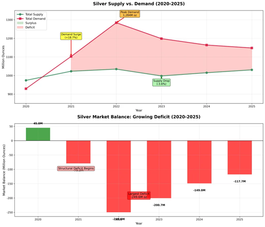 Die Silbermarktlandschaft hat sich seit 2022 dramatisch verändert, was die Theorie stützt, dass eine strategische Akkumulationsphase möglicherweise abgeschlossen ist. Das globale Silberdefizit erreichte 2024 215,3 Millionen Unzen, bedingt durch ein robustes Wachstum der industriellen Nachfrage, und wird Prognosen zufolge bis 2025 weiterhin erheblich bleiben.