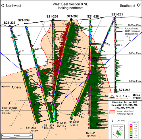 Holes S21-256, 265, 266, and 268 are infill holes at West Seel and all encountered long intervals of continuous mineralization that will help define grade within those volumes. Hole S21-265 intersected 402 metres grading 0.50% copper equivalent. Hole S21-266 intersected 495 metres grading 0.54% copper equivalent including significant zones with higher grades. Hole S21-268 intersected 270 metres grading 0.47% copper equivalent starting at 20 metres depth and will extend the zone of near surface West Seel mineralization to the southeast. Assays are pending for the bottom portion of the hole. Holes S21-259, 260, 261, and 263 were all drilled on the edges of the West Seel system and all encountered significant mineralization that will help expand the known extents of the West Seel deposit.