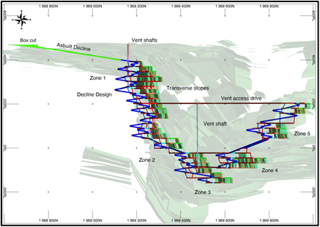 Approximately 500 meters of ramp development have now been completed. Surface and Underground mine infrastructure including mine dry, ventilation raises, electrical and pumping installations are underway. The development of the decline relative to the current Phase 1 Mine Plan is shown in the longitudinal section and the plan view below.