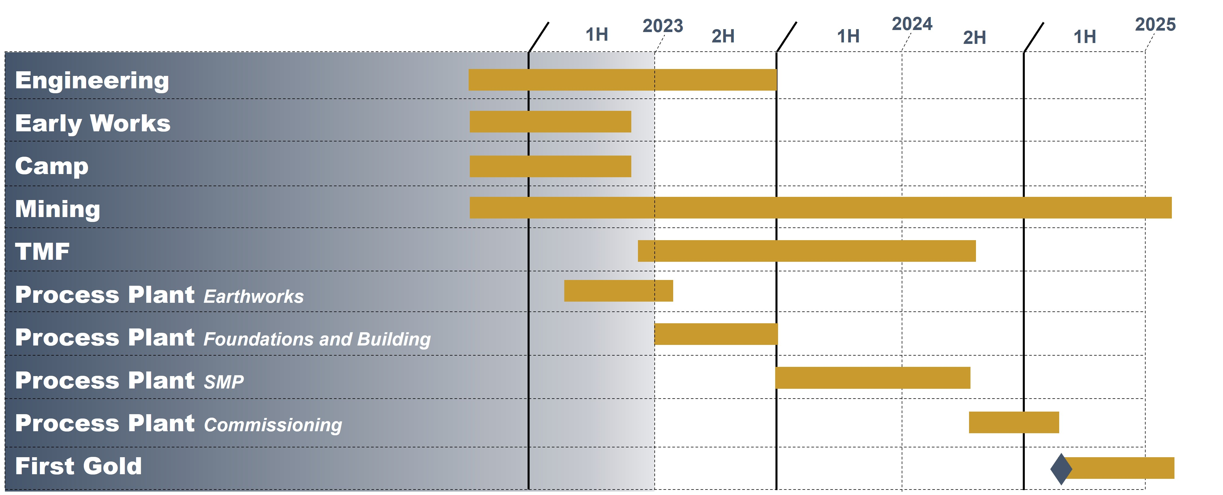 On the one-year anniversary since the Corporation made a formal construction decision (announced on September 12, 2022), the Project is 51% complete and remains on track and on budget for commercial production in H2-2024. Construction is 46% complete, with work initiated on almost all Project areas. In addition, total spend to date is $281 million with open commitments of $82 million for a total committed to date of $363 million (79% of project total) and is tracking in line with the Feasibility Study.