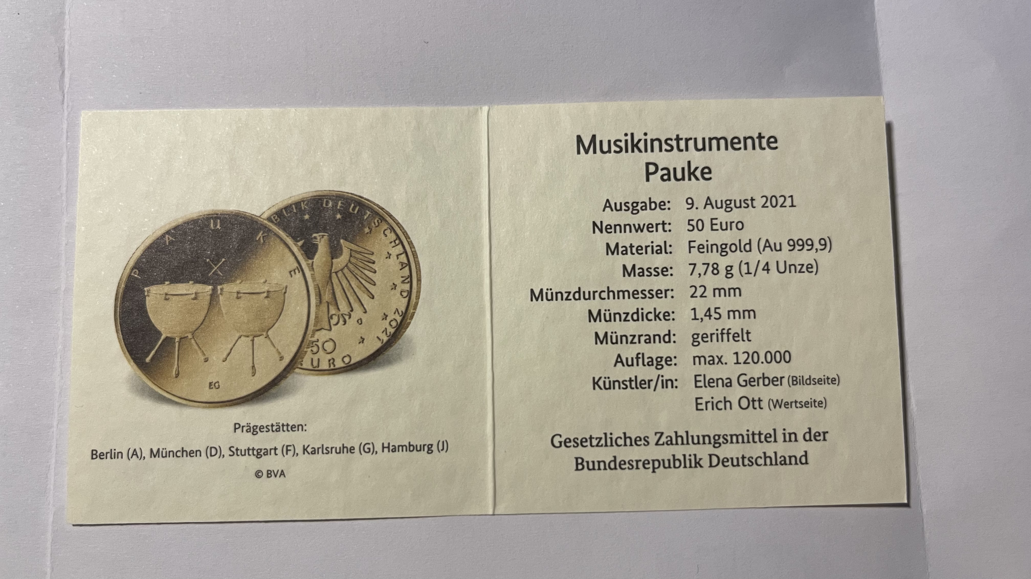 Gestern kam per DHL die erste Münze „Pauke“ bei mir an. Bekanntlich ist dies die vierte von insgesamt fünf Münzen der Serie „Musikinstrumente“. Preislicher Highflyer ist hier bisher der Hammerflügel (2019), die einzige Münze, die ich nicht habe, war ja klar. ![]()