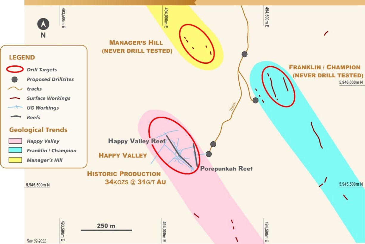 Wir freuen uns auch darüber, dass nahe gelegene Ziele, einschließlich der Goldabbaustätten Champions/Franklin und Managers Hill, nun für ihr erstes Bohrtestprogramm bereit sind. Dies könnte es uns ermöglichen, mehrere Ausläufer in unmittelbarer Nähe des hochgradigen Happy-Valley-Systems zu identifizieren.