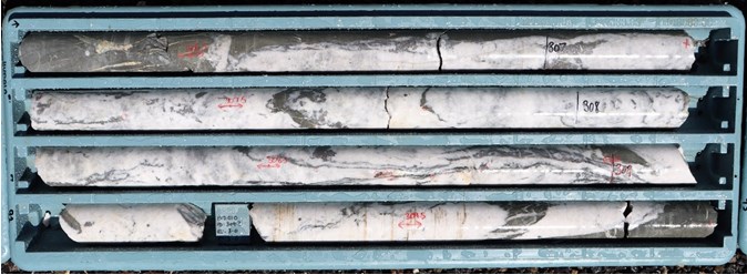 • Die Ergebnisse beinhalten 3 m mit 5,8 g/t Gold (Au) aus 390,0 m und 0,6 m mit 5,23 g/t Au aus 374,4 m innerhalb einer breiteren Zone, einschließlich 37,3 m mit 0,9 g/t Au aus 356,7 m Bohrloch.