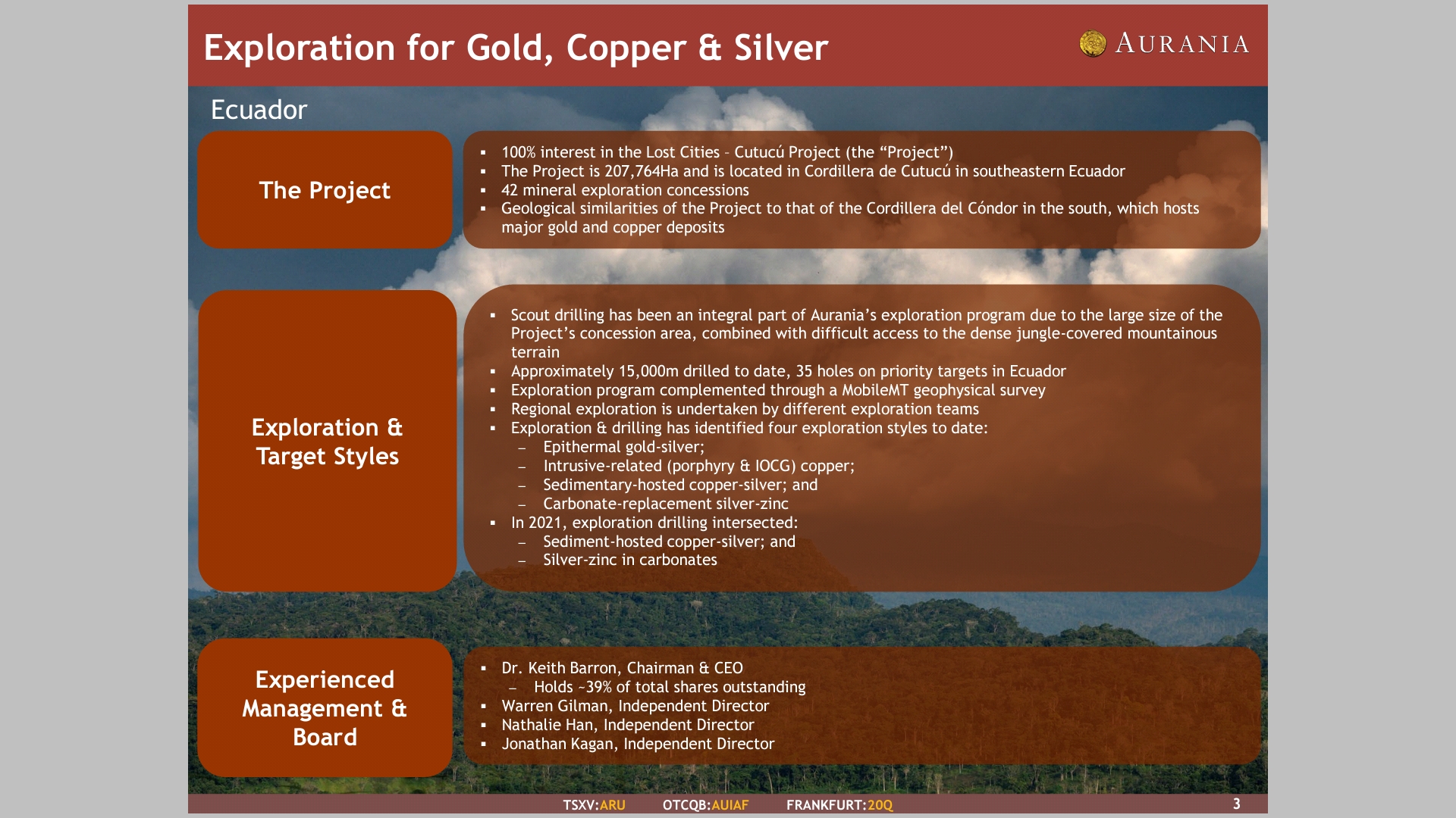 Zitat von Aurania Res.Alles anzeigen- Außergewöhnliche Erfolgsbilanz bei Entdeckungen in Ecuador: CEO Keith Barron und sein Team entdeckten die epithermale Gold-/Silberlagerstätte Fruta del Norte
