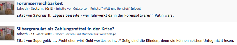 -- Es fehlen ganze Jahrgänge in der Beitragsübersicht zu Fachbeiträgen, was die Suchfunktion fragwürdig macht. Bei der Suche zu einer bekannten Goldaktie weist das Suchsystem 2 Beiträge von 2006 in Nebenthemen aus, lächerlich, da in diesem Fall viele zig allein von mir erstellt wurden.
