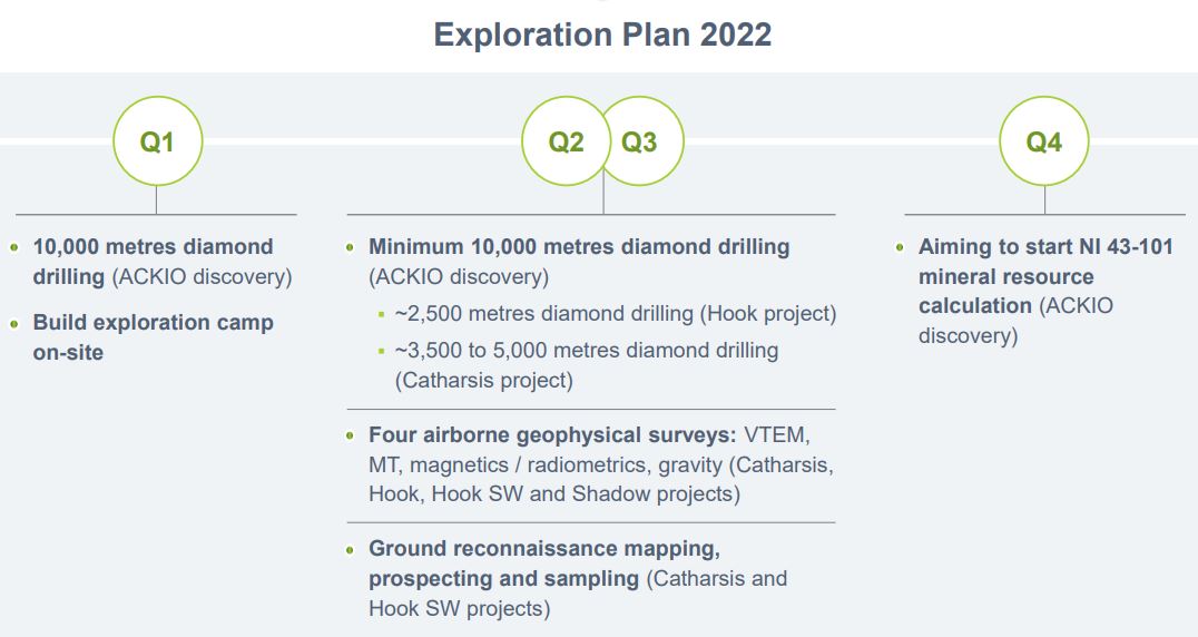 Im September 2021 wurde beim ersten Bohrprogramm des Unternehmens bereits eine vielversprechende erste, oberflächennahe Mineralisierung durchschnitten. Diese Entdeckung wird gerade mit einem 10.000 m Bohrprogramm weiter bebohrt. Newsflow ist also in den nächsten Wochen und Monaten garantiert.
