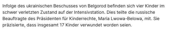 Der Beschuß von Belgorod heute könnte für die Amis Argumente liefern, aus dem Konflikt aus zu steigen. Das war kein Angriff auf militärische Ziele sondern ein Akt des Terrors gegen die Zivilbevölkerung. Den russischen Medien zufolge kamen tschechische RM-70 MLRS zum Einsatz. Wenn ich mich recht erinnere, dann wurden die Raketenwerfer unter der Bedingung in die Ukraine geliefert, daß sie nicht zum Beschuß von russischen Boden, sondern nur innerhalb der ukrainischen Grenzen eingesetzt werden dürfen.