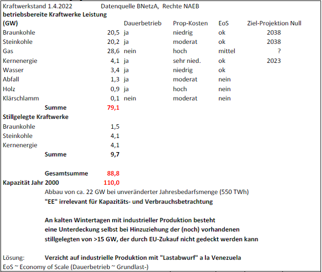 Klartext: Selbst wenn man die stillgelegtem Kraftwerke wieder hochfährt (ohne Kohle und Gas??) kommt man mathematisch präzise auf mögliche 88,8 GW im Jahre 2022.