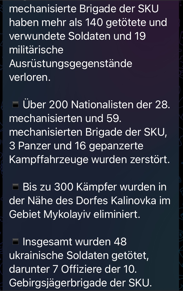 Niemand sagt wirklich die Wahrheit, aber dementiert werden die Zahlen ja von der Gegenseite auch nie und somit dürften die Infos zumindest qualitativ schon stimmen, was bedeutet: Hunderte tote Soldaten auf ukr. Seite, viele Aktivitäten und diverse Verluste an Panzern, Fahrzeugen sowie abgefangene HIMARS- uns Totschka-Raketen.