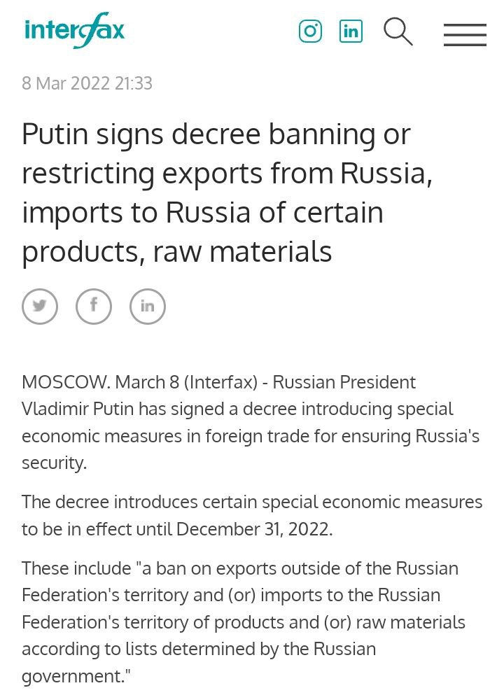 Lese gerade, daß Russland vorhin ein komplettes Exportverbot für Öl und Gas gegen unfreundliche Staaten erlassen habe.