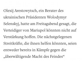 ....und dann heisst es hier in dem Welt online Artikel plötzlich, dass Mariupol keine ukrainische Unterstürzung erwarten könne, da man selber an anderen Abschnitten einem übermächtigen Feind gegen über stünde.