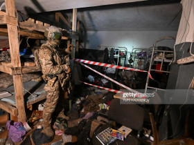 Russische Soldaten untersuchen die Keller von Azovstahl.