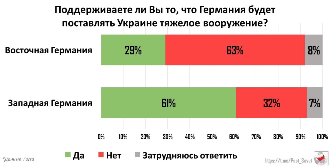 • Für Waffenlieferungen sind 29% der Ostdeutschen und 61% der Westdeutschen