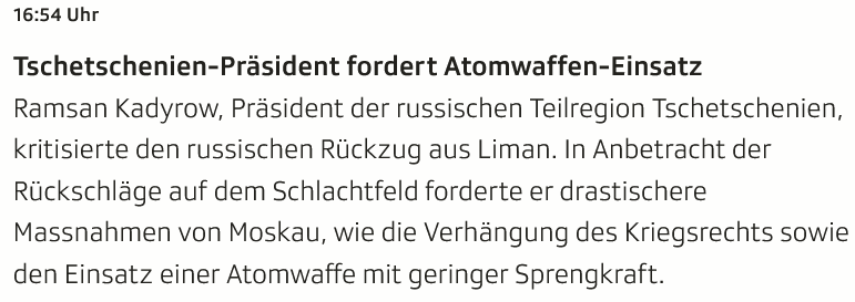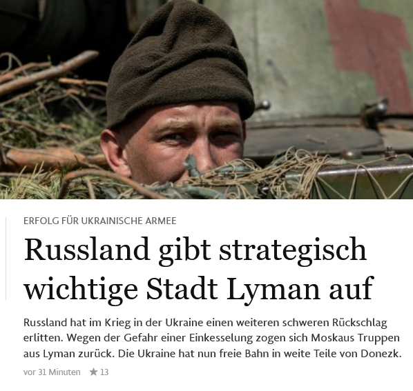 In Lyman sieht die Lage für die Russen katastrophal aus. Lyman liegt im Oblast Donezk. Offenbar ist der Kreml nicht einmal in der Lage regional und punktuell seine Truppen in Not mit zusätzlichen Verbänden zu unterstützen. Die russische Luftwaffen erzeugt kaum mehr eine spürbare Wirkung. Die Ukrainer bewegen offenbar fast nach Belieben schweres Gerät und sitzen immer noch 10 km vor Donezk. Ich frage mich, wie es um die Bestände der gelenkten Munition bei den Russen aussieht.