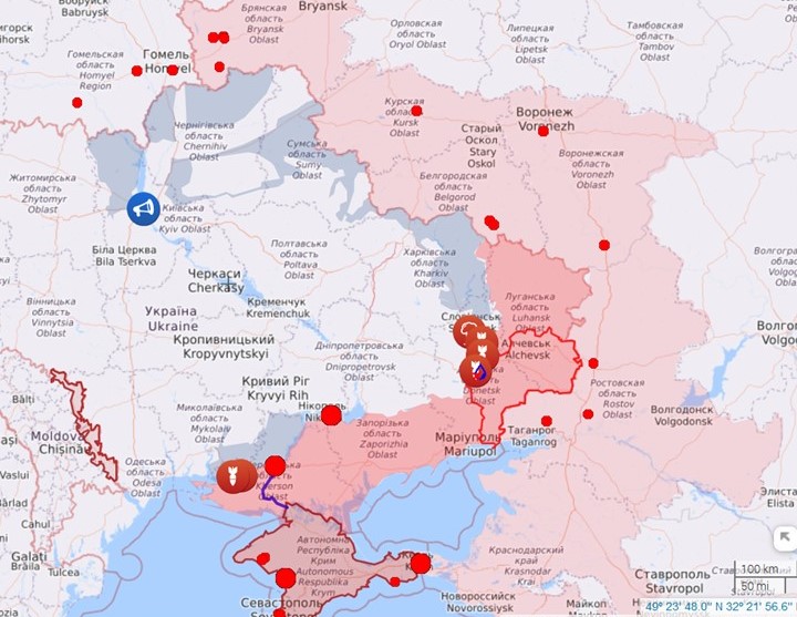 Weiter suggeriert die Karte, die vor ein paar Tagen noch übersät war mit Symbolen für Kampfhandlungen, eine weitgehende Ruhe an fast der gesamten Frontlinie, was man ebenso glauben kann, aber wohl nicht muss: