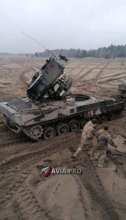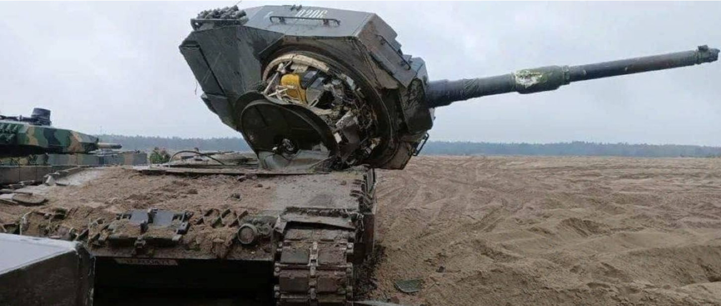 Zerstörter deutscher Leo 2A4. Dies geschah ohne Feindkontakt, das haben die Ukris ganz alleine fertig gebracht. Während einer Übung in Polen überquerte der Panzer einen Hügel, dabei bohrte sich das Geschütz in das Erdreich blieb stecken und riß den Geschützturm aus der Wanne heraus.
