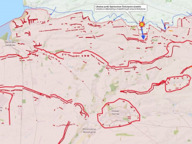 • Das sind die russischen Verteidigungslinien bei Saporoshje. Anhand der blauen Markierung kann man erkennen, wie weit die NATO bis jetzt gekommen ist.