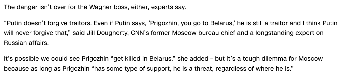 „Putin verzeiht Verrätern nicht. Selbst wenn Putin sagt: ‚Prigoschin, geh nach Weißrussland‘, ist er immer noch ein Verräter, und ich denke, Putin wird das nie verzeihen“, sagte Jill Dougherty, ehemalige Moskauer Büroleiterin von CNN und langjährige Expertin für russische Angelegenheiten.
