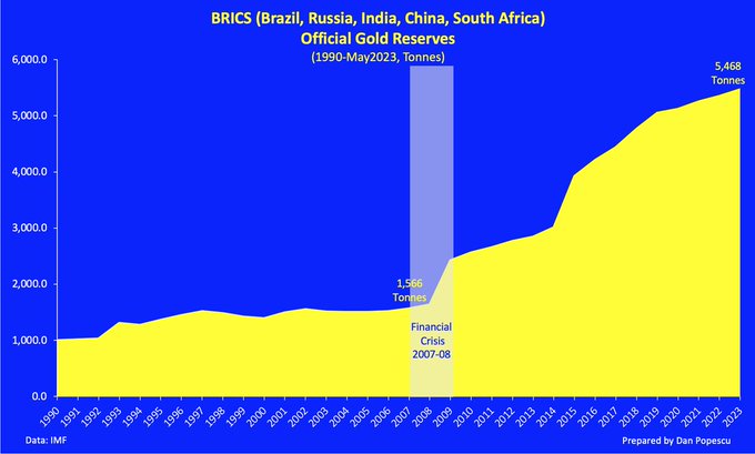 BRICS (Brasilien, Russland, Indien, China, Südafrika) Offizielle Goldreserven (1990-Mai 2023, Tonnen)