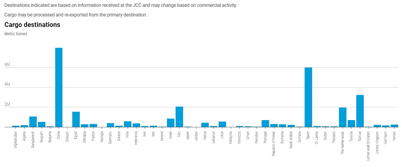Die Antwort: "Das Welternährungsprogramm der Vereinten Nationen (WFP – die größte humanitäre Organisation der Welt) transportiert ebenso Weizen aus den Schwarzmeerhäfen. Vor dem Krieg kaufte das Programm die Hälfte seines Getreidebestands aus der Ukraine. Seit Beginn der Initiative im August 2022 haben über 625 000 Tonnen Weizen die ukrainischen Häfen in Richtung Äthiopien, Jemen, Afghanistan, Sudan, Somalia, Kenia und Dschibuti verlassen."