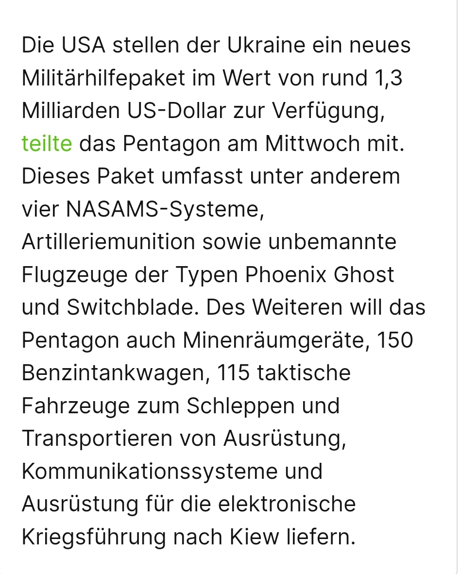 Das Weiße Haus hat soeben bestätigt, dass US-Streumunition bereits geliefert wurde und von den ukrainischen Streitkräften "seit etwa einer Woche" eingesetzt wird. -