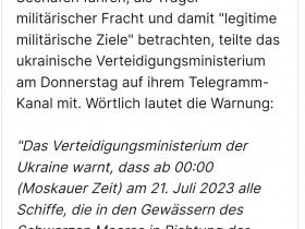 ZitatDas ukrainische Verteidigungsministerium kündigte außerdem ein Verbot der Schifffahrt in den Gebieten des nordöstlichen Teils des Schwarzen Meeres und der Straße von Kertsch ab dem 20. Juli an.