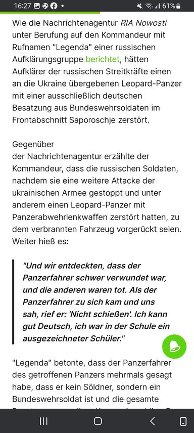 • Aber Dafür sendet Scholz 1 bemannten LEO Panzer (4Hansel) an die Saporischia Front wo sie natürlich entdeckt und vernichtet werden und lösen damit eine Kriegsbeteiligung aus.