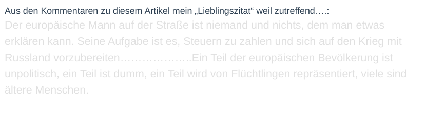 Der europäische Mann auf der Straße ist niemand und nichts, dem man etwas erklären kann. Seine Aufgabe ist es, Steuern zu zahlen und sich auf den Krieg mit Russland vorzubereiten………………..Ein Teil der europäischen Bevölkerung ist unpolitisch, ein Teil ist dumm, ein Teil wird von Flüchtlingen repräsentiert, viele sind ältere Menschen.