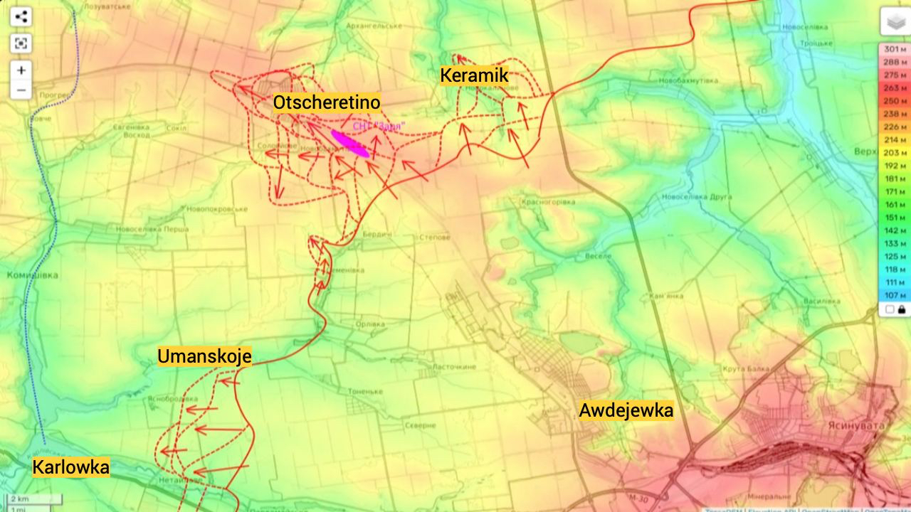 Dort ging es in den letzten 48h richtig voran, es kommen dort nur noch schwache Verteidigungsstellungen. Otscheretino liegt auf einer Anhöhe, damit ist das Gebiet mit Radius 20km einsehbar.
