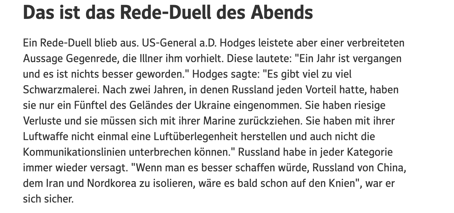 "Maybrit Illner diskutierte am Donnerstagabend (30.) mit ihren Studiogästen über die Frage: Sollte der Westen es der Ukraine erlauben, mit den gelieferten Waffen auch auf russisches Territorium zu schießen? Die Runde fand auf die Frage schnell eine eindeutige Antwort. US-General a.D. Ben Hodges zeigte außerdem auf, was passieren müsste, damit Russland schon bald in die Knie gezwungen wäre."