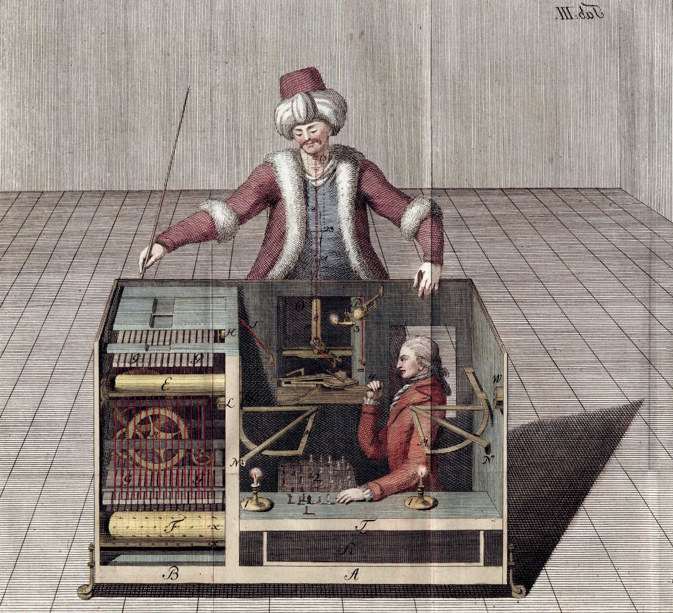 Der Ausdruck entstammt aus dem Jahre 1769. Damals baute der österreichisch-ungarische Hofrat Wolfgang von Kempelen den sogenannten "Schachtürken". Diese Apparatur wurde als Roboter verkauft, der in der Lage ist, seine menschlichen Kontrahenten im Schachspiel zu bezwingen. Der Roboter war als Türke dargestellt. Doch was die staunenden Zuseher nicht wussten: In dem Apparat befand sich ein Schachmeister, der die Figuren mittels eines Magneten bewegte. Der Schwindel flog nur deshalb auf, da ein Zuschauer während einer Vorführung "Feuer, Feuer" rief und der Spieler aus dem "Schachtürken" heraussprang.