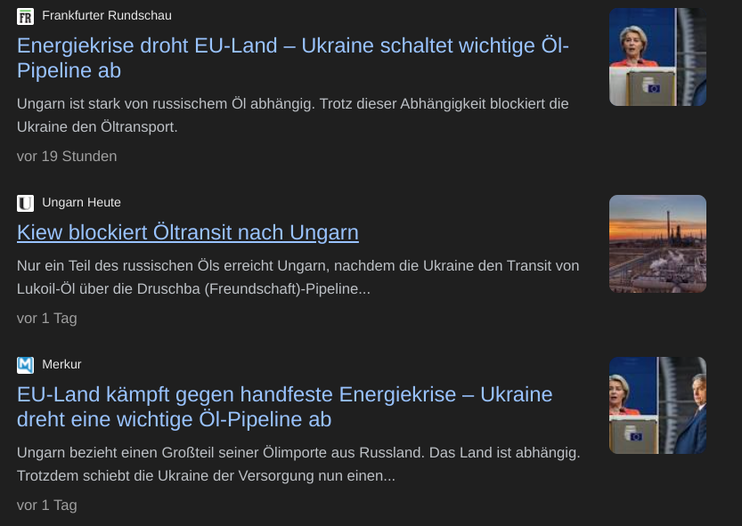 Stand z.B. auch schon am 21.07.2024 in der Weltwoche: Ungarn steht vor Energiekrise: Kiew blockiert russische Öllieferungen durch die Ukraine (weltwoche.de)