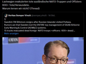 Der schwedische Außenminister Billstrom tratt zurück, nachdem eine Ansammlung ukrainischer und ausländischer Truppen in Poltawa von Iskander-Raketen getroffen wurde.