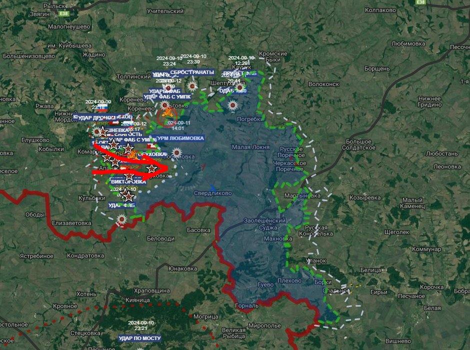 Grün gestrichelt: Ist-Frontlinie mit dem großen russischen Einfall der letzten beiden Tage (roter Pfeil)
