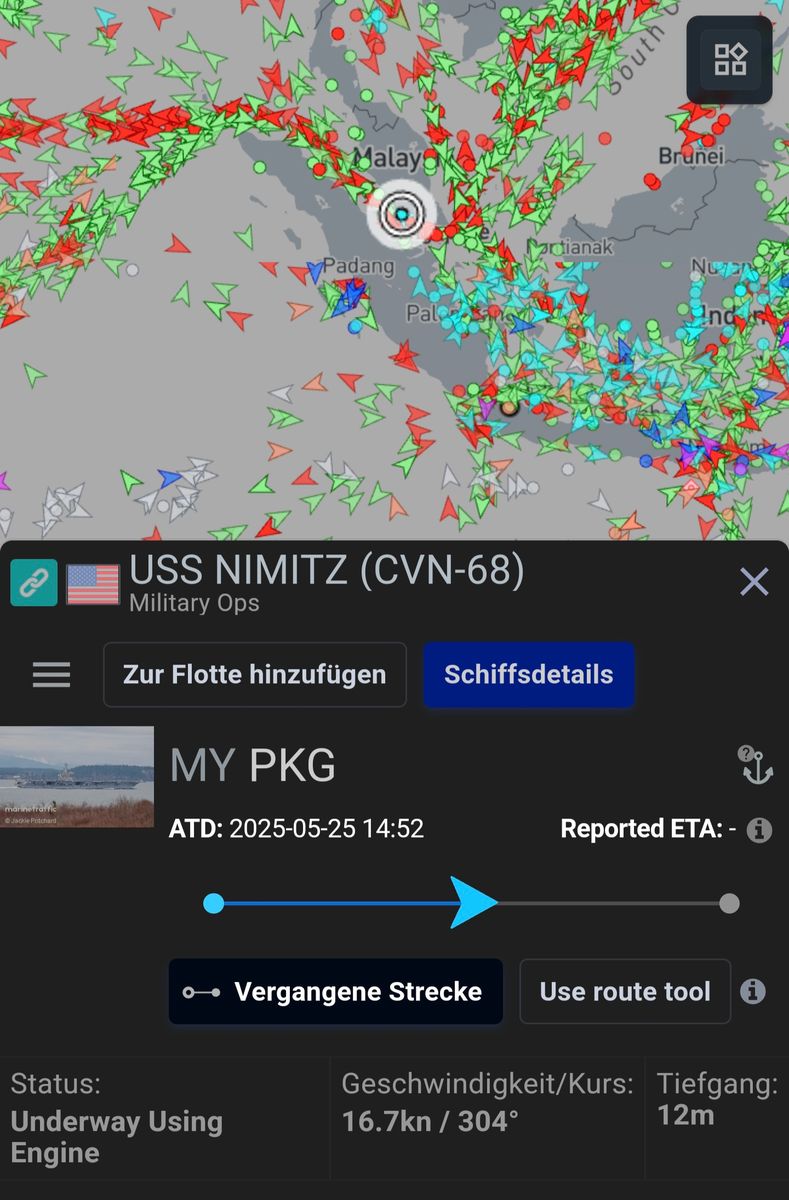 • Der Flugzeugträger U.S.S. Nimitz ist in der Nähe von Malaysien aktuell und fährt 17 Knoten..