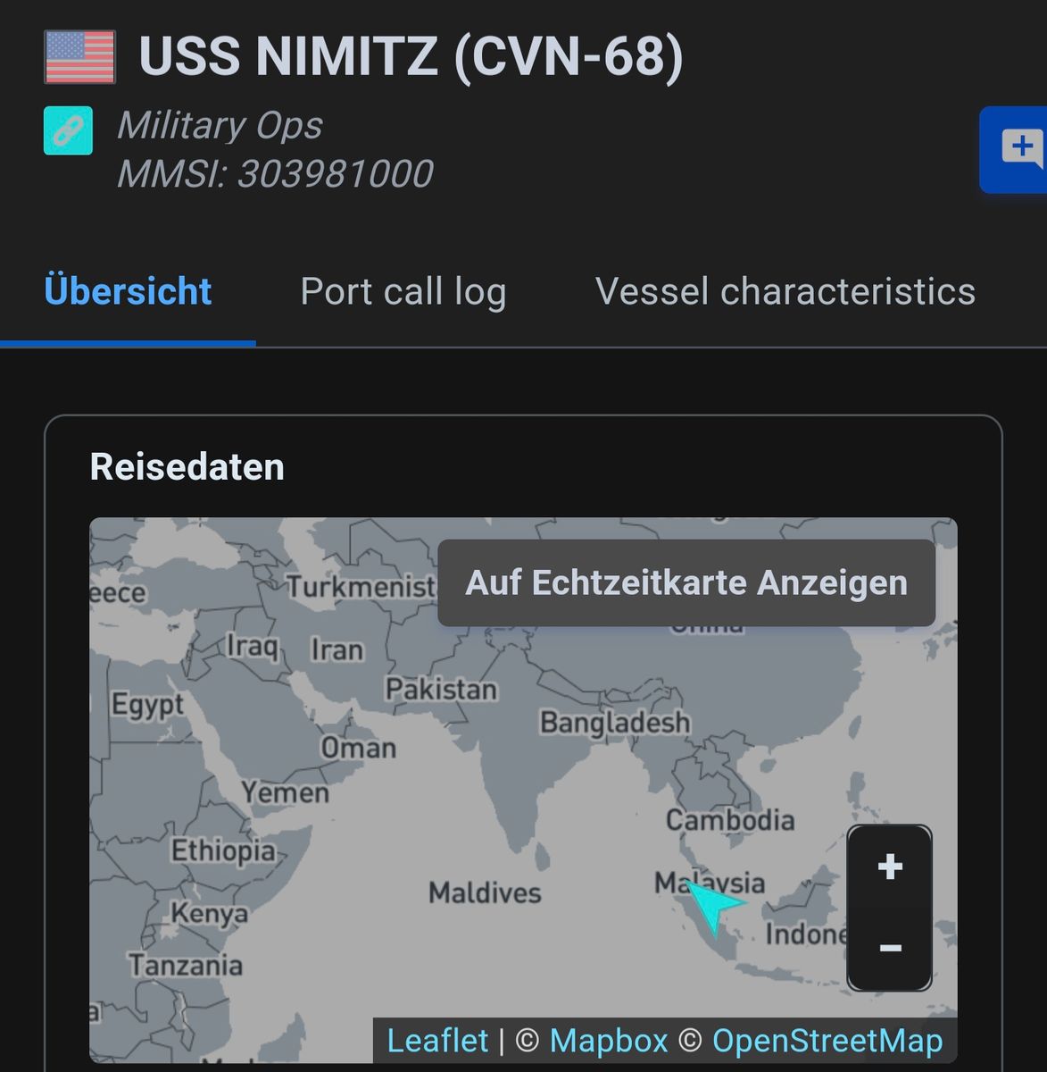 • Der Flugzeugträger U.S.S. Nimitz ist in der Nähe von Malaysien aktuell und fährt 17 Knoten..