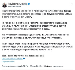 Der Minister für Digitalisierung Krzysztof Gawkowski erklärte, Nawrockis Entscheidung bedeute „de facto das Ende des Starlink-Internets, das Polen der Ukraine zur Verfügung gestellt hat“.