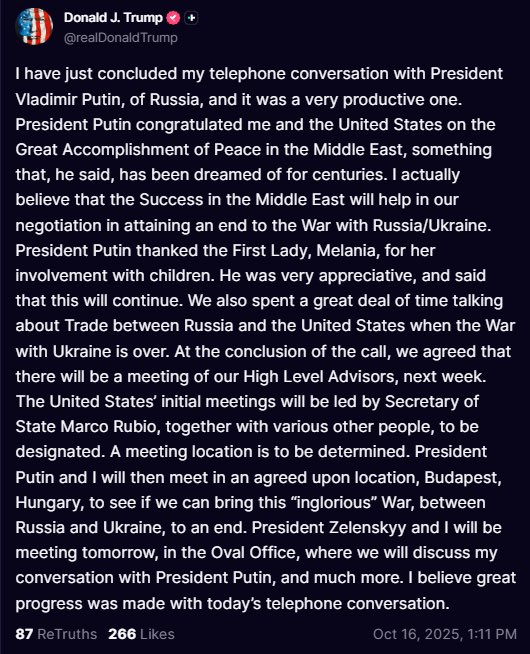 "Ich habe gerade mein Telefongespräch mit dem russischen Präsidenten Wladimir Putin beendet, und es war ein sehr produktives Gespräch. Präsident Putin gratulierte mir und den Vereinigten Staaten zur großen Verwirklichung des Friedens im Nahen Osten, von dem er seit Jahrhunderten träumt. Ich glaube tatsächlich, dass der Erfolg im Nahen Osten dazu beitragen wird, dass wir den Krieg mit Russland/Ukraine beenden können. Präsident Putin dankte der First Lady Melania für ihre Beteiligung an Kindern. Er war sehr dankbar und sagte, dass dies weitergehen werde. Wir haben auch viel Zeit damit verbracht, über den Handel zwischen Russland und den Vereinigten Staaten zu sprechen, wenn der Krieg mit der Ukraine vorbei ist. Am Ende des Aufrufs haben wir vereinbart, dass es nächste Woche ein Treffen unserer hochrangigen Berater geben wird. Die ersten Treffen der Vereinigten Staaten werden von Außenminister Marco Rubio zusammen mit verschiedenen anderen Personen geleitet, die benannt werden sollen. Ein Treffpunkt ist zu bestimmen. Präsident Putin und ich werden uns dann an einem vereinbarten Ort, Budapest, Ungarn, treffen, um zu sehen, ob wir diesen "unrühmlichen" Krieg zwischen Russland und der Ukraine beenden können. Präsident Selenskyj und ich werden uns morgen im Oval Office treffen, wo wir mein Gespräch mit Präsident Putin und vieles mehr besprechen werden. Ich glaube, dass mit dem heutigen Telefongespräch große Fortschritte erzielt wurden."