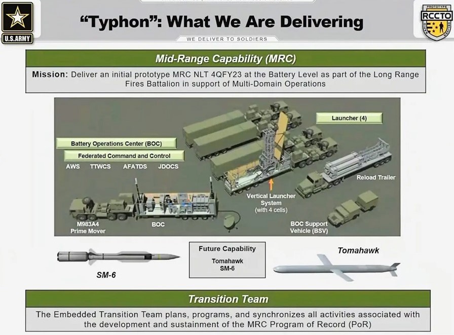 Eine Batterie besteht aus vier solchen mobilen Typhon- Startrampen mit je vier Zellen, so dass bis zu 16 Tomahawks abgeschossen werden können. Dazu ein mobiler Kontroll- und Kommandoposten, ein Ladefahrzeug und ein Unterstützungsfahrzeug. Dieses Programm wurde 2020 lanciert, um diese kritische Lücke zu füllen, also die Tomahawks auch von Land starten zu können.